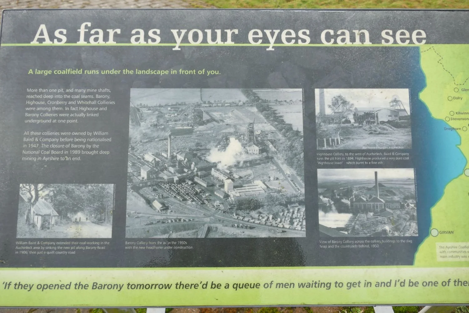 So, let’s go north of the border to investigate another scarred ex-colliery landscape. We have arrived at the site of the former Barony Colliery in east Ayrshire, a mine which operated over a very similar time span to those of the Kent Coalfield. This time the entrepreneur was one William Baird whose company established the mine around 1910 (sources vary on the exact date) to feed the local iron industry.
